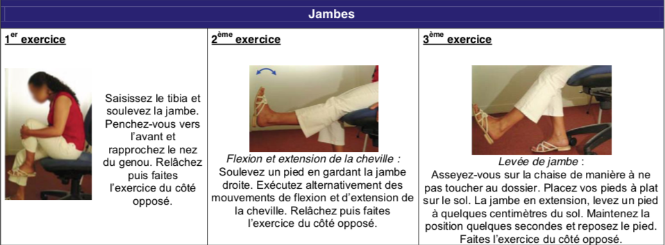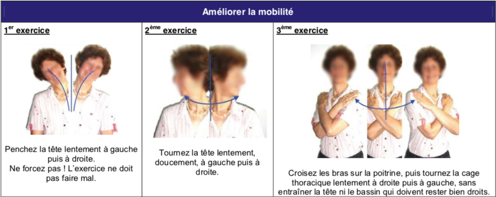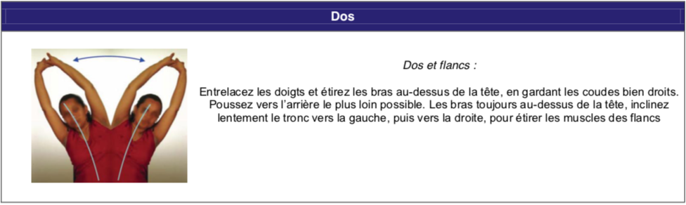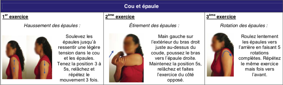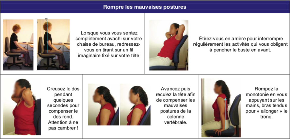 Ne pas oublier que toute posture, même idéale, devient nocive si elle est maintenue trop longtemps. Il est donc conseillé de changer régulièrement de position, de se lever, de marcher et de détourner le regard de l'écran (pour éviter la fatigue visuelle). Il faut également, si cela est possible, faire les mouvements illustrés ci-dessous :